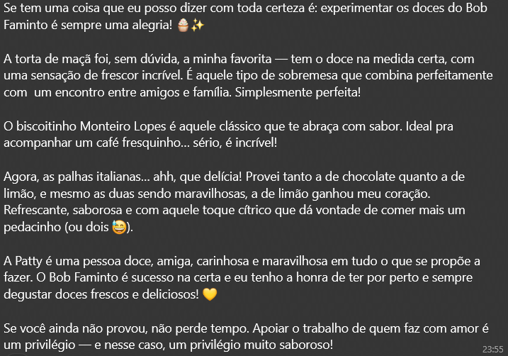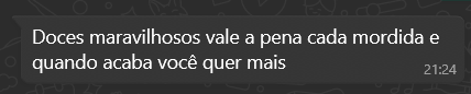 Mas o que realmente adoça o nosso dia são as palavras de quem já experimentou nossos sabores e compartilhou um pedacinho de felicidade com a gente. 💕